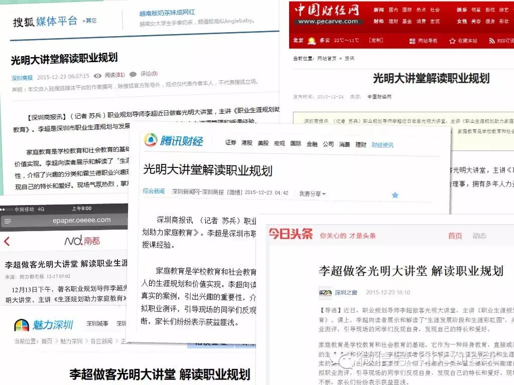 12月13日,前海生涯副总经理李超老师受邀做客“光明大讲堂”,从生涯规划的角度解读家庭教育,此讲座引发现场听众及媒体的广泛关注,腾讯网、搜狐网、今日头条、中国财经网、《南方都市报》、《深圳商报》等众多媒体进行了报道或转载。