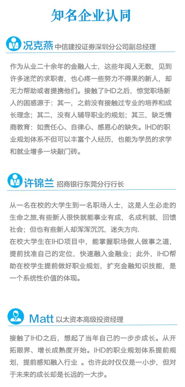 * 增强国际视野,从专业知识、实战经验、沟通能力、人脉运营等方面,全方位体会环球金融格局